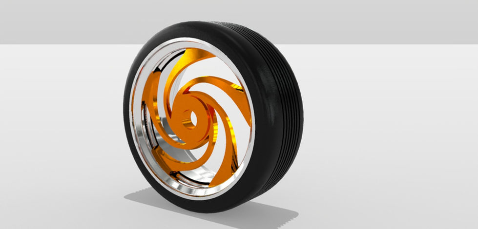 Em uma segunda abordagem de design, a roda incorpora um conjunto de “pás” torcidas em forma de espiral, com pintura laranja metálica/perolizada em alto brilho. Essa geometria contínua e fluida intensifica a sensação de dinamismo e rotação, criando um visual esportivo e energético que se destaca frente ao aro de tom prata mais frio.